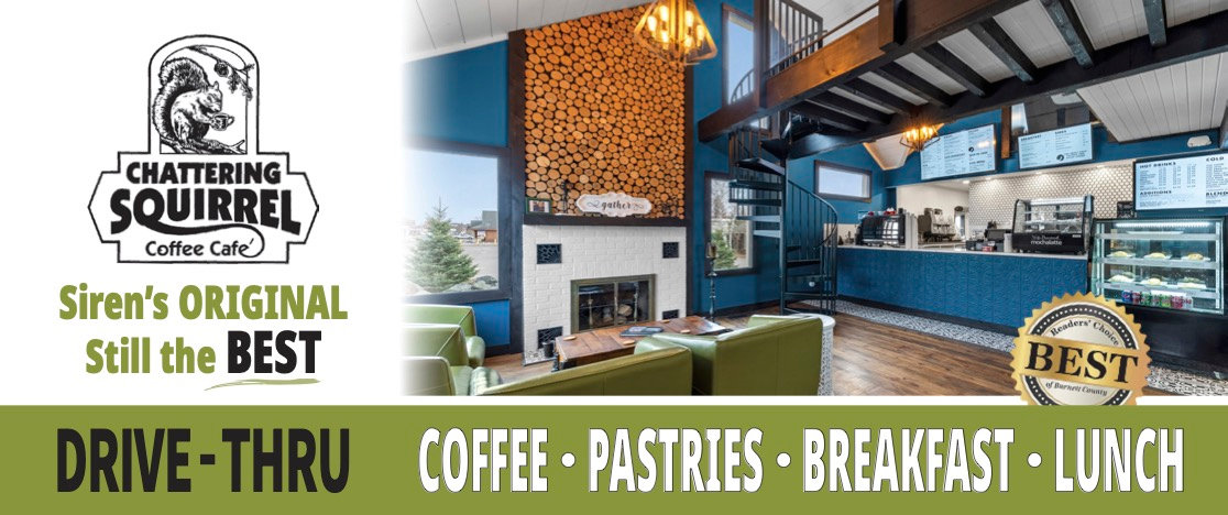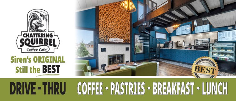 Chattering Squirrel is an award winning, coffee shop located in Siren, WI, which happens to be a very popular vacation destination. There are so many cabins and lakes in Siren and the surrounding area! And hey, not to mention, a great coffee shop offering Drive-Thru Coffee, Expanded Indoor and Outdoor Seating + Coffee, Tea, Smoothies, Breakfast, Lunch, Homemade Pastries and Baked Goods, Soups, Salads, Sandwiches, Paninis, and More! I highly recommend!